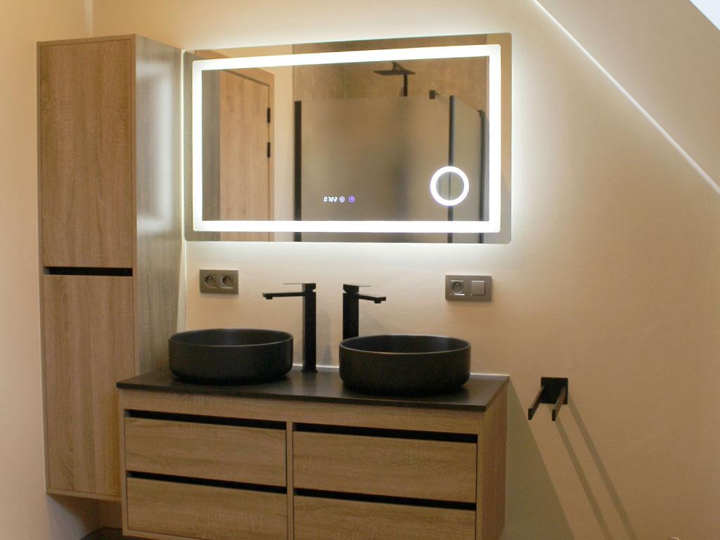 Badkamer met ruime inloopdouche, dubbele wastafel en toilet