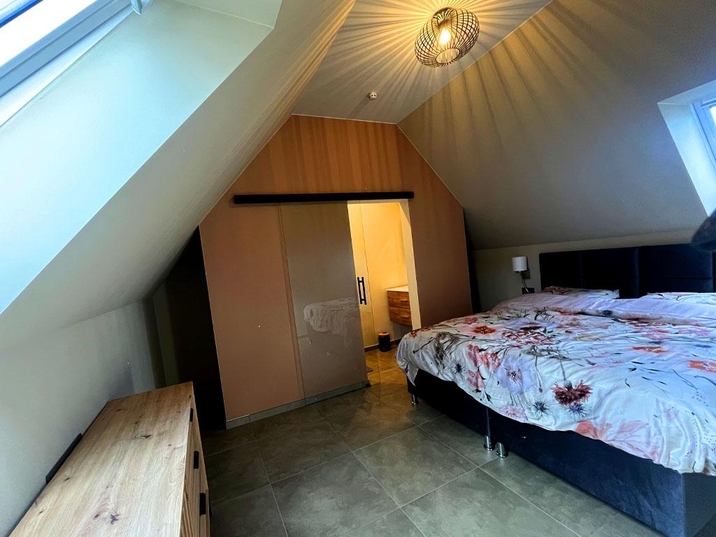 Masterbedroom met tweepersoonsbed (1m80), inloopdouche en lavabo