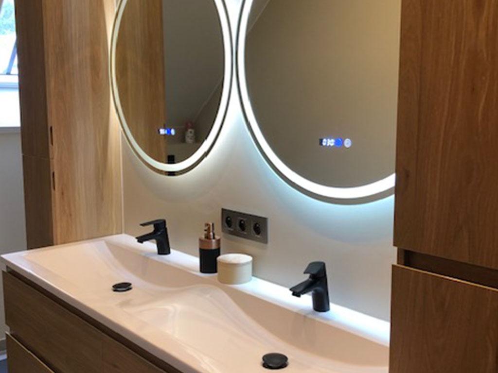 Badkamer met ruime inloopdouche, dubbele wastafel en toilet