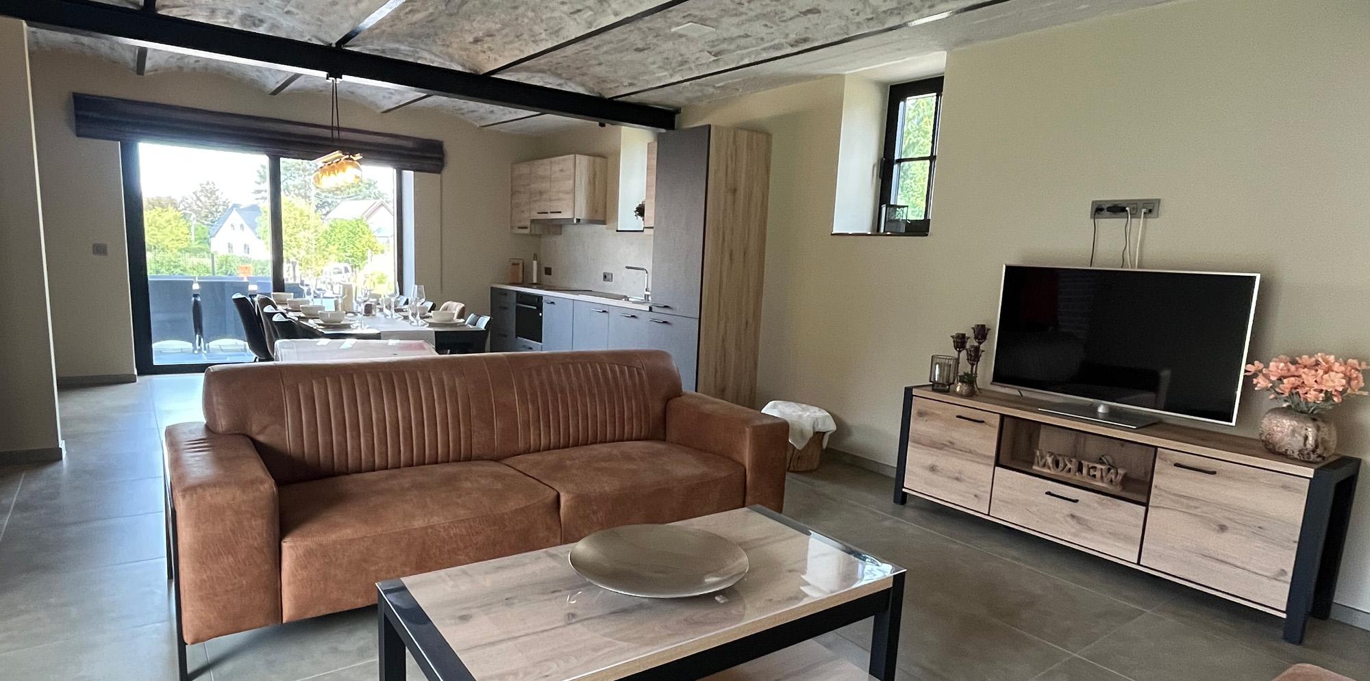 Gezellige leefruimte met comfortabele zithoek en eethoek