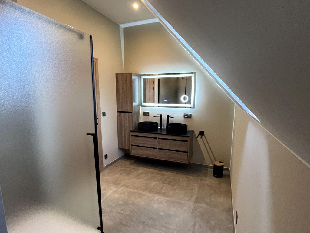 Badkamer met ruime inloopdouche, dubbele wastafel en toilet